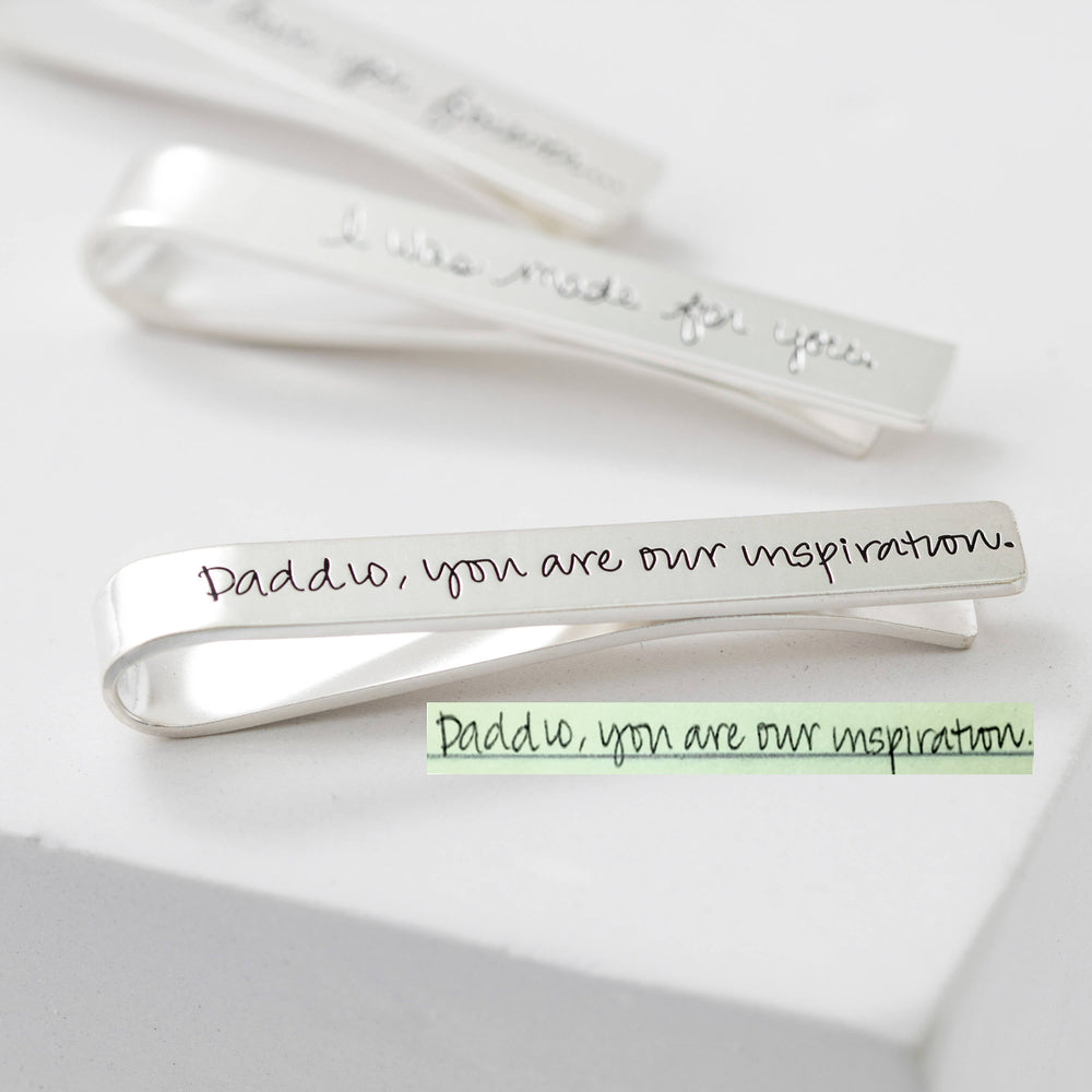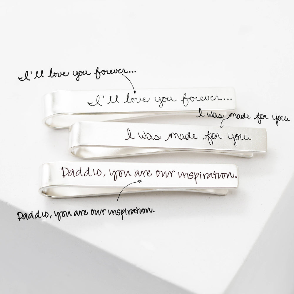 Elevate your formal attire with the Handwriting Tie Clip, expertly crafted to secure your tie with subtle sophistication. This accessory offers a sleek, polished finish while ensuring your tie stays perfectly in place throughout the day. Ideal for professionals seeking refined detail, it combines functionality with a distinctive personal touch that enhances any suit.
