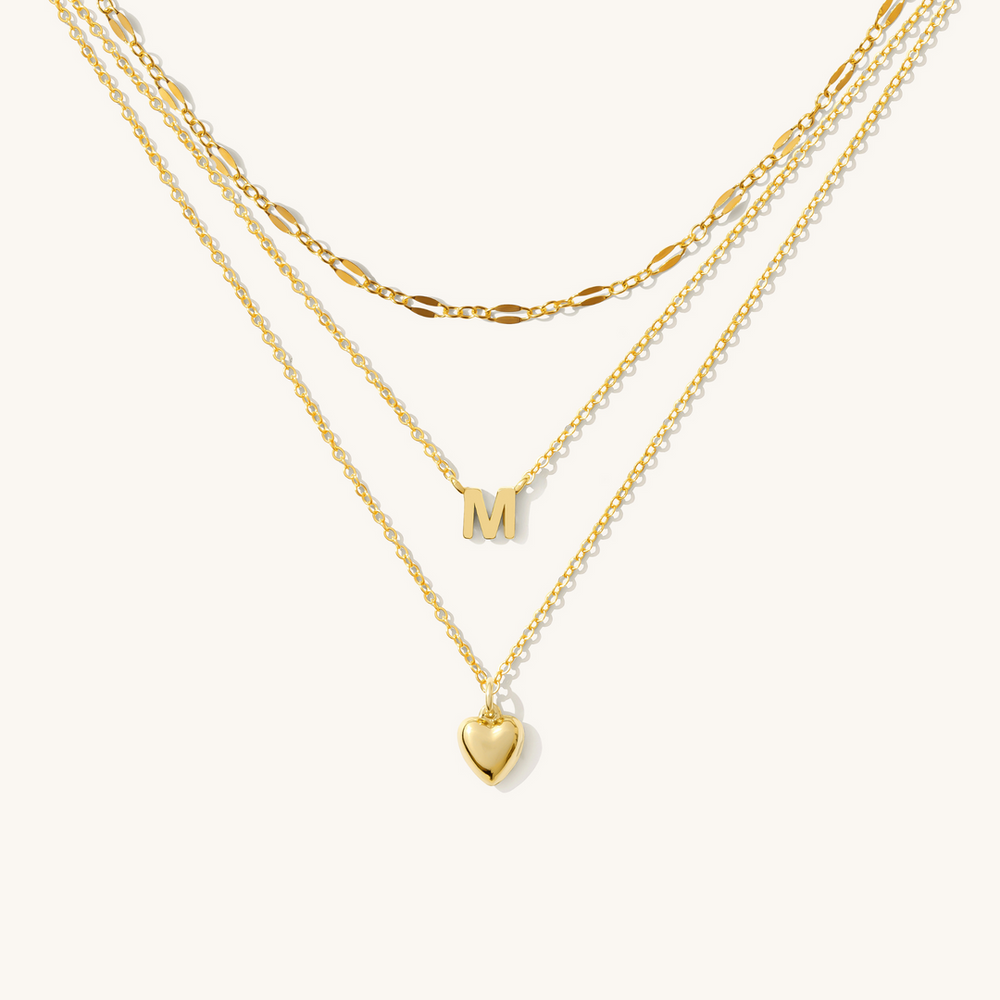 Elevate your accessory collection with this personalised layered necklace set, expertly crafted to combine style and individuality. Each layer is thoughtfully designed to complement one another, creating a harmonious and sophisticated look. Customise the set to reflect your unique identity, making it a perfect statement piece for any occasion. This necklace set offers versatility and elegance, enhancing your outfit with a refined, personalized touch.