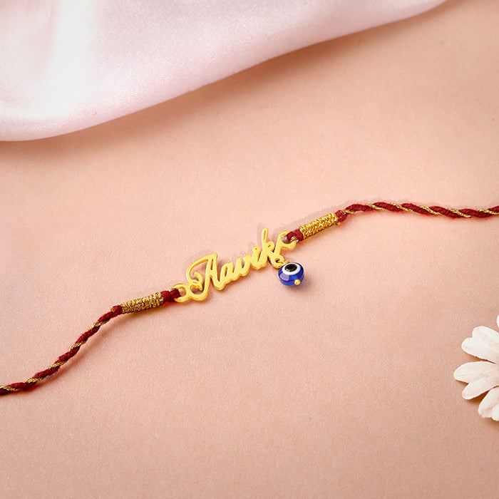 The Golden Personalised Name Nazar Battu Rakhi combines traditional protection with personalized elegance. Crafted in a rich golden finish, this rakhi features a customizable name element, serving as a powerful charm to ward off negative energies. Its expert design balances cultural significance with a refined look, making it a meaningful and stylish choice for celebrating the special bond of Raksha Bandhan.